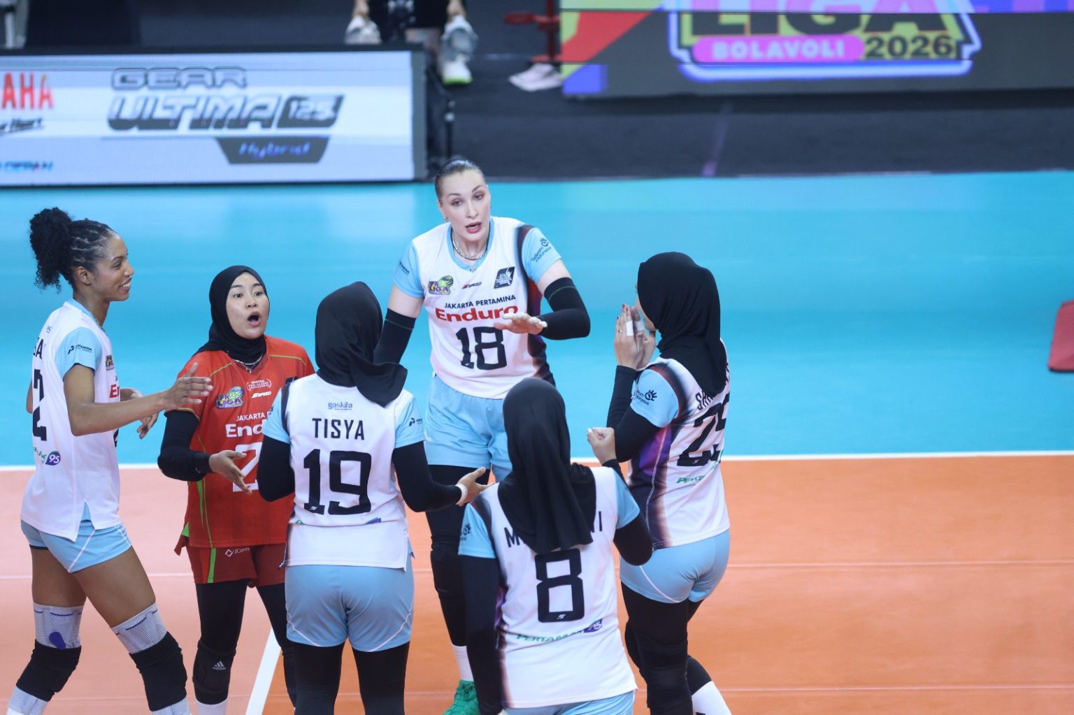 YOGYAKARTA – Juara bertahan tim putri Jakarta Pertamina Enduro (JPE) mengamankan satu kemenangan atas Gresik Phonska Plus Pupuk Indonesia dengan skor meyakinkan 3-1 (19-25, 25-19, 25-19, 25-21) pada Leg 1 Grand Final Proliga 2026 di GOR Amongrogo, Yogyakarta, Jumat (24/4/2026).